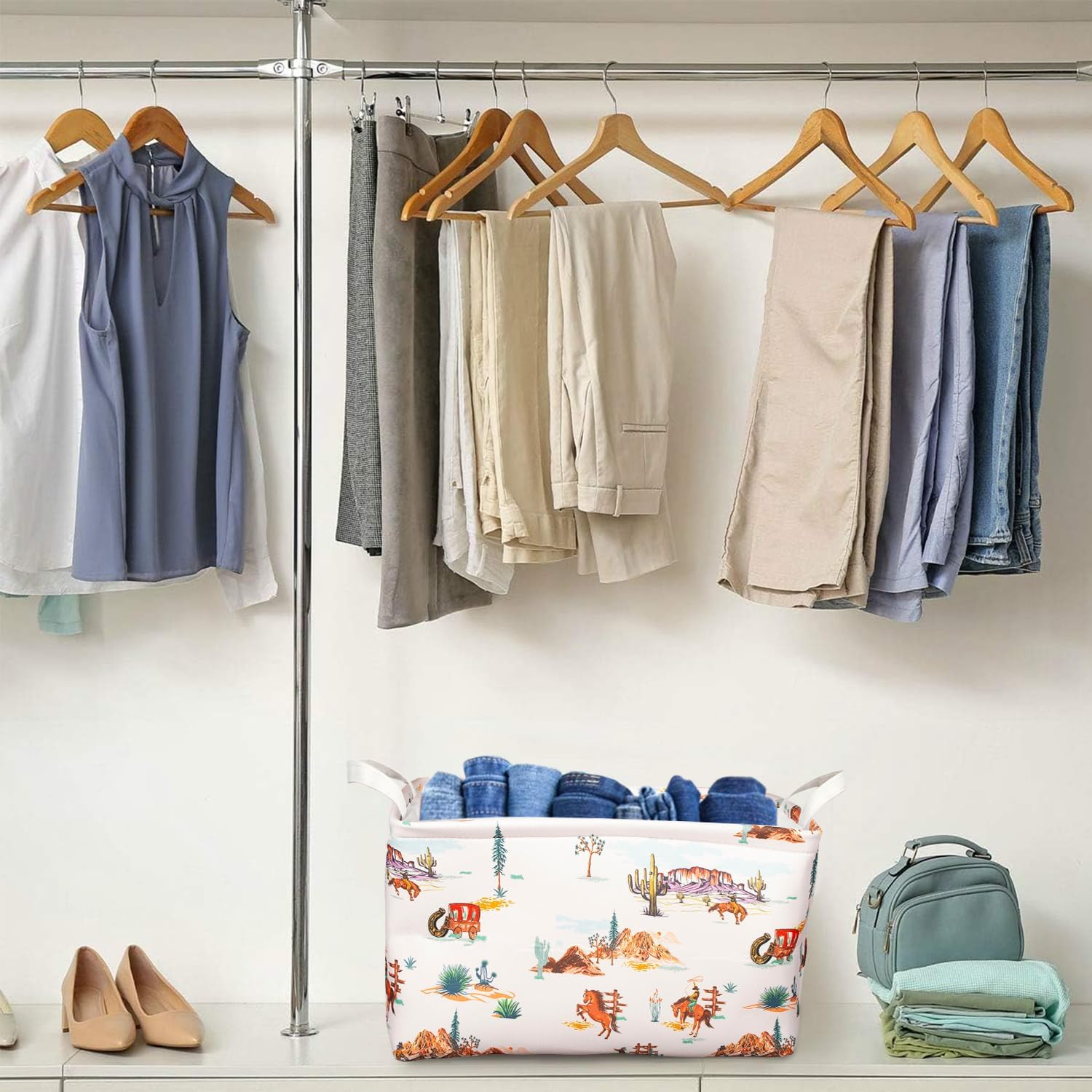【RUGGED WESTERN CHARM】 Embrace bold style with three distinct western cow boy-inspired prints, blending rustic aesthetics into modern spaces. Sturdy canvas handles on both sides enhance durability while complementing the rugged theme, transforming practical storage into striking decor.