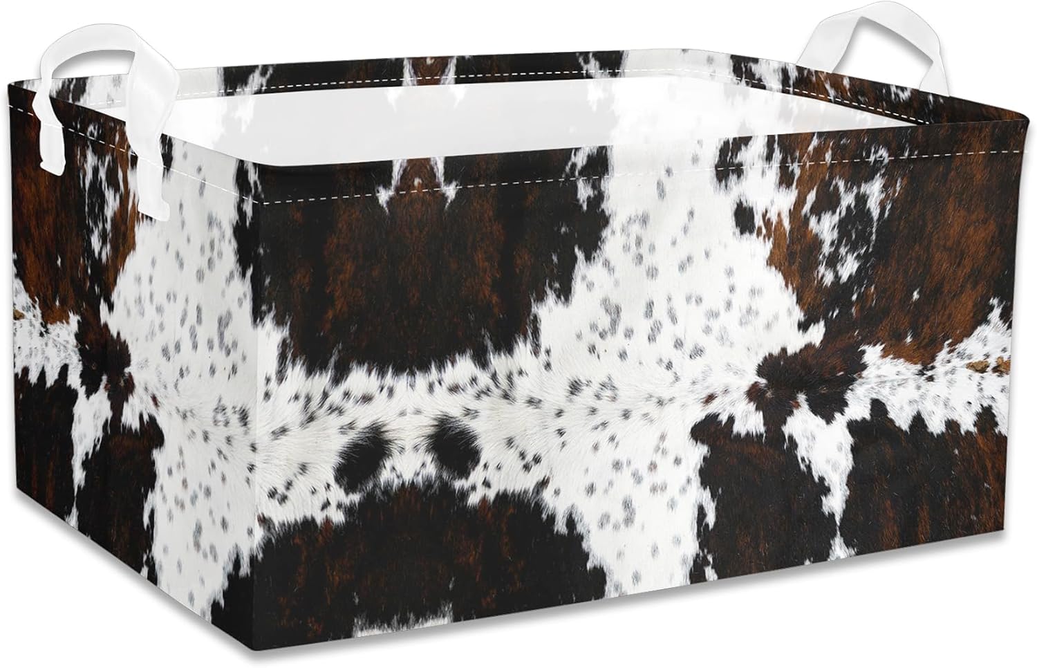 【VERSATILE 3-PACK SET】 Each medium-sized western basket measures 13.7×9.8×6.6 inches (40×30×20cm), offering ample storage for baby items, clothes, toys, linens, and more. Sold as a 3-piece set, these cowskin bins effortlessly organize multiple rooms while showcasing unique Western-themed prints on each cowboy basket.