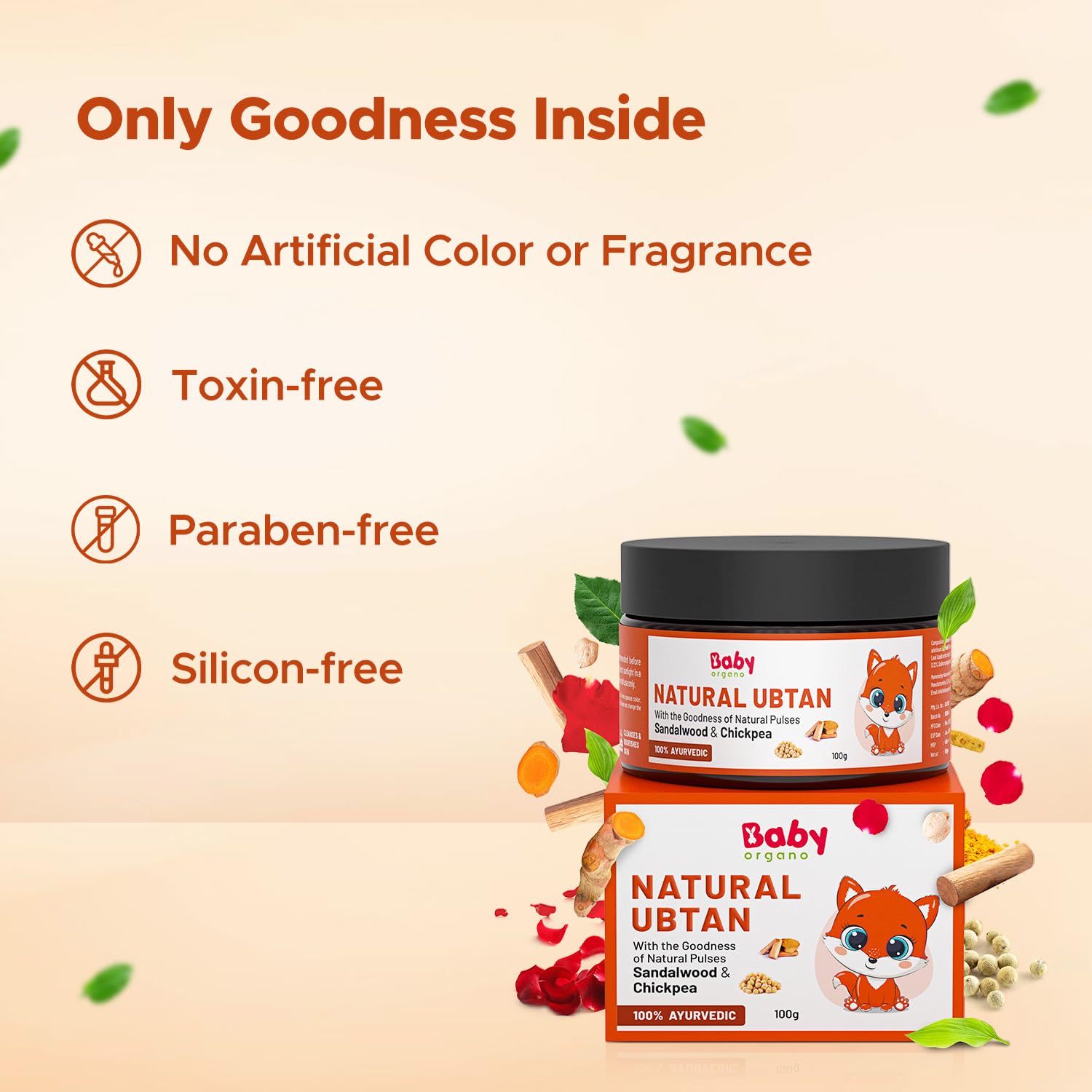 BabyOrgano Natural Ubtan – Ayurvedic Bath Powder for Tan Removal Glowing Skin This 100% Ayurvedic bath powder is a gentle blend of green gram, sandalwood, and turmeric, crafted to naturally cleanse, brighten, and soften skin. Ideal for kids and women, it helps remove tan, reduce dullness, and promote a healthy glow—without harsh chemicals. Safe for daily use and FDCA approved, this traditional Ubtan offers a time-tested skincare ritual for smooth and radiant skin.
