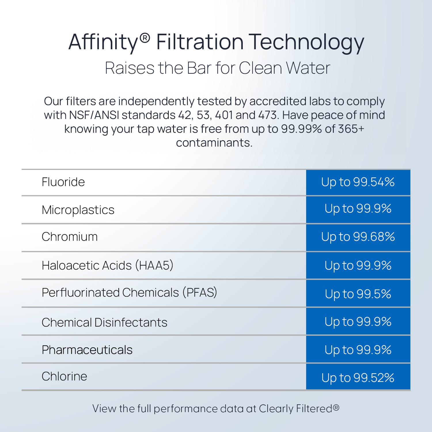 Advanced Affinity Filtration Technology – Our proprietary filtration system targets and removes up to 99.9% of 365+ contaminants from tap water, including fluoride, lead, BPA, PFAS / PFOA, HAA5, arsenic, microplastics and perchlorate. Our intelligent technology does not target beneficial minerals – so you can trust every drop. The proprietary blend of filtration materials captures more contaminants than other filters by ionically binding and extracting contaminants.