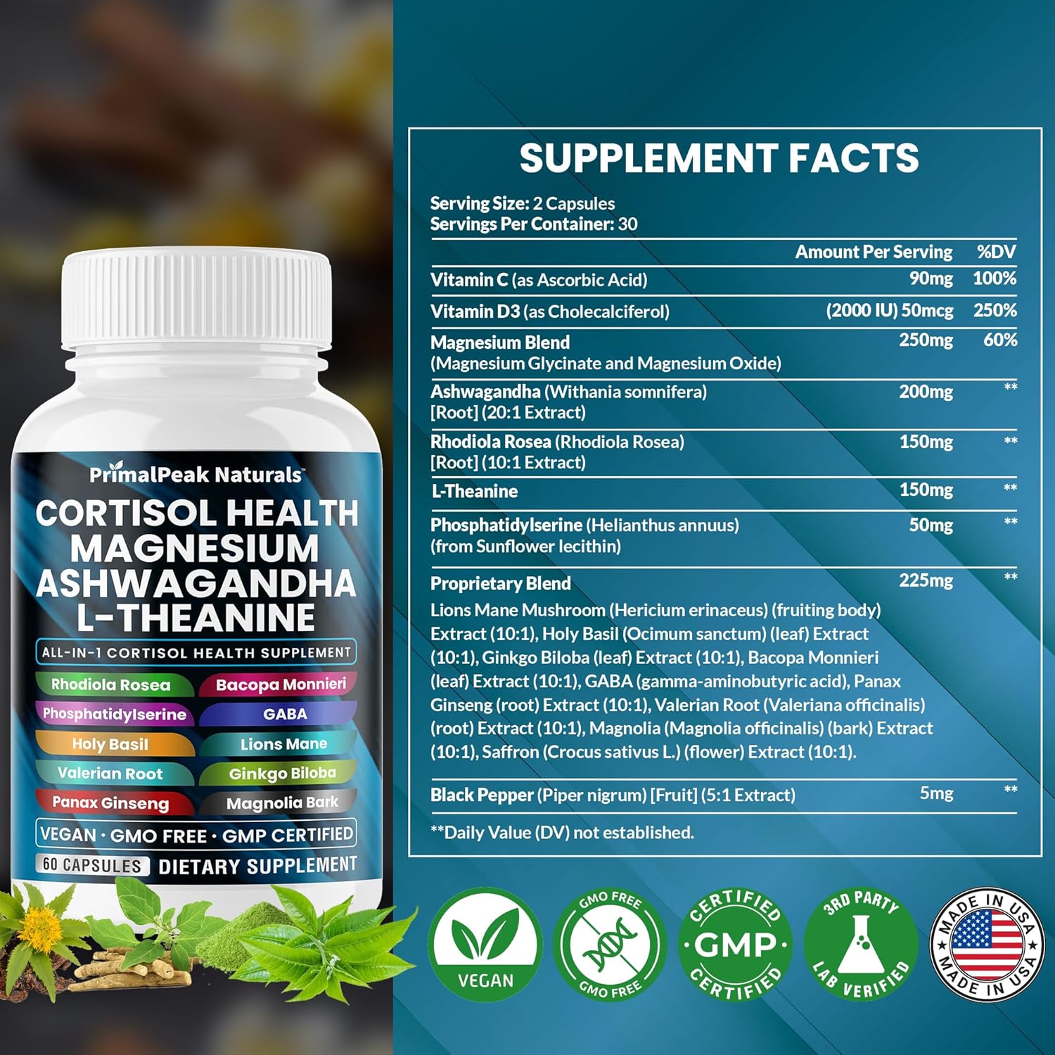 Discover the powerful combination of Magnesium, Ashwagandha, L-Theanine, Phosphatidylserine, Rhodiola Rosea in our comprehensive Cortisol Health Supplement. This premium blend of magnesium glycinate, ashwagandha capsules, l theanine, panax ginseng, holy basil capsules and rhodiola supplement is expertly crafted to meet the demands of a fast-paced lifestyle and support overall wellness by aiding in the effective regulation of cortisol levels and stress relief.