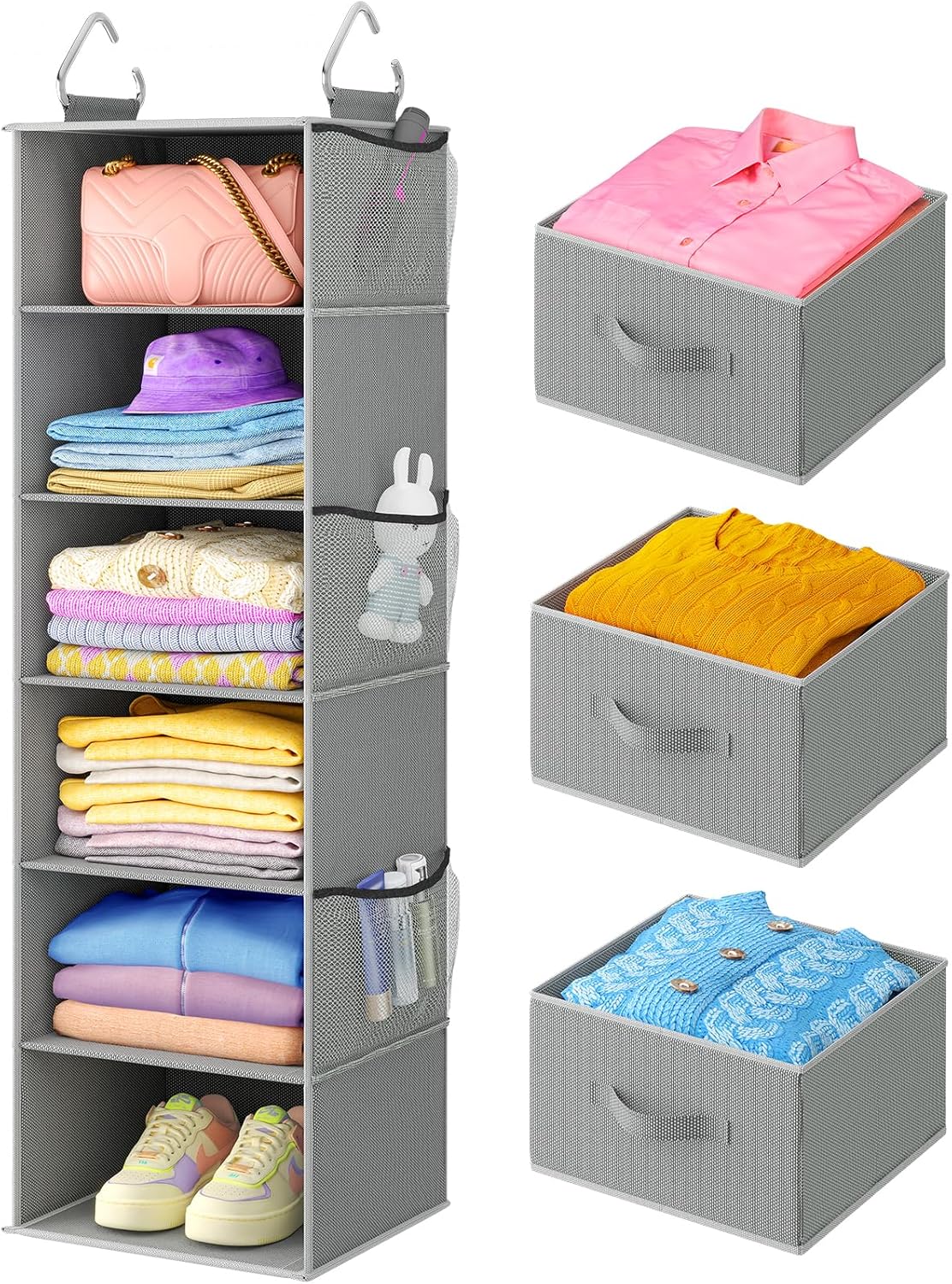 13 reviews for Pipishell Hanging Closet Organizer 6-Shelf, Hanging Shelves for Closet with 3 Removable Drawers & Side Pockets for Bedroom or Garment Rack, 12′ x 12′ x 43.3′, Dark Gray