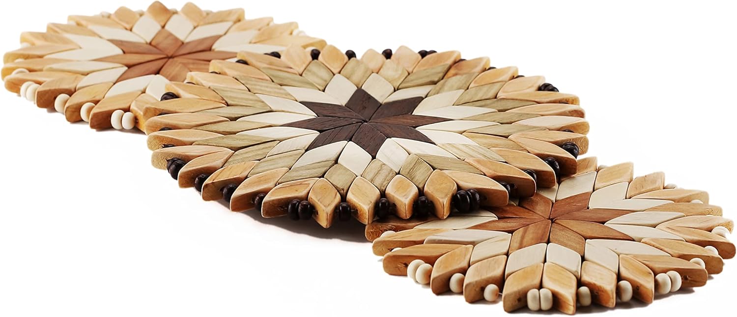 Good looking trivets, they are relatively small, but work well for all my pans and pots. They can also work as oversized coasters. They are very pretty and well made, I saw some people’s reviews, where they would use them as wall ornaments and I can see why they chose to hang them. Overall very happy with the purchase. I imagine they all differ in color and shapes, but they are handmade. I was neither paid nor offered any products for my review.