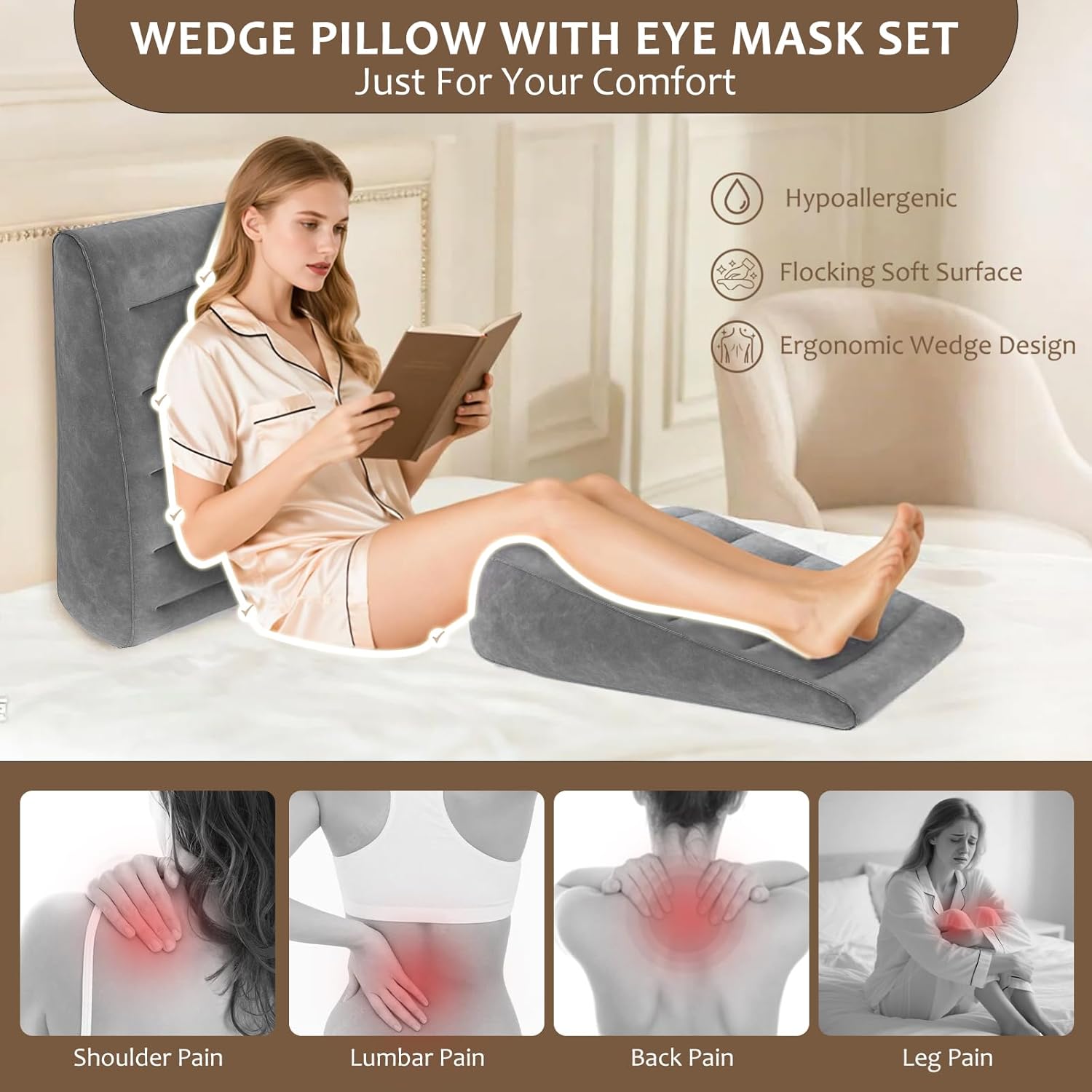 𝗢𝗻𝗲 𝗣𝗶𝗹𝗹𝗼𝘄. 𝗢𝗻𝗲 𝗘𝘆𝗲 𝗠𝗮𝘀𝗸. 𝗘𝗻𝗱𝗹𝗲𝘀𝘀 𝗨𝘀𝗲𝘀. – More than just a wedge pillow for sleeping, this all-in-one comfort kit includes a premium silk eye mask to create a calming, light-free environment. Use it as a headboard wedge, backrest pillow for sitting in bed, or reading cushion—the eye mask adds the finishing touch. Ideal for students, seniors, and expecting moms.
