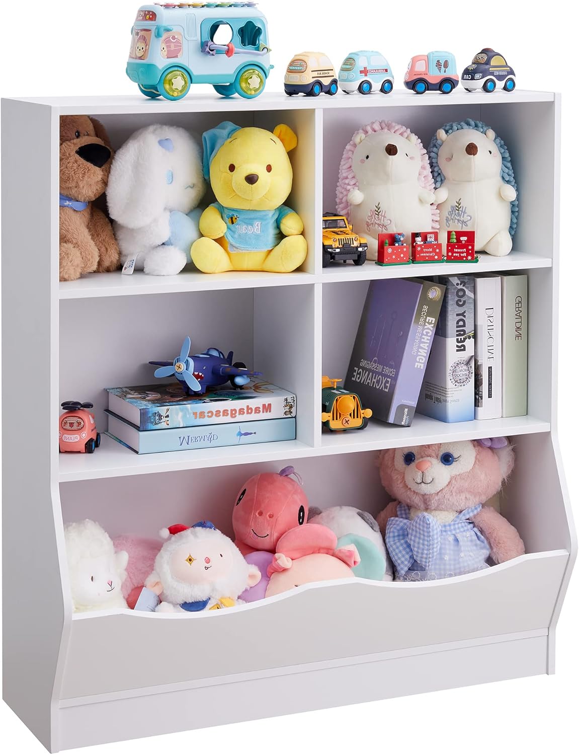♪【Multifunctional Storage Organization】: With four compartment cabinets and one large bottom bin, this toy storage organizer can easily store and display a variety of items, such as books, toys, art supplies and more, making the children’s messy rooms neat and orderly rather than having a bunch of toy bins all over; In addition, you can add fabric or weave bins to create fun concealed storage