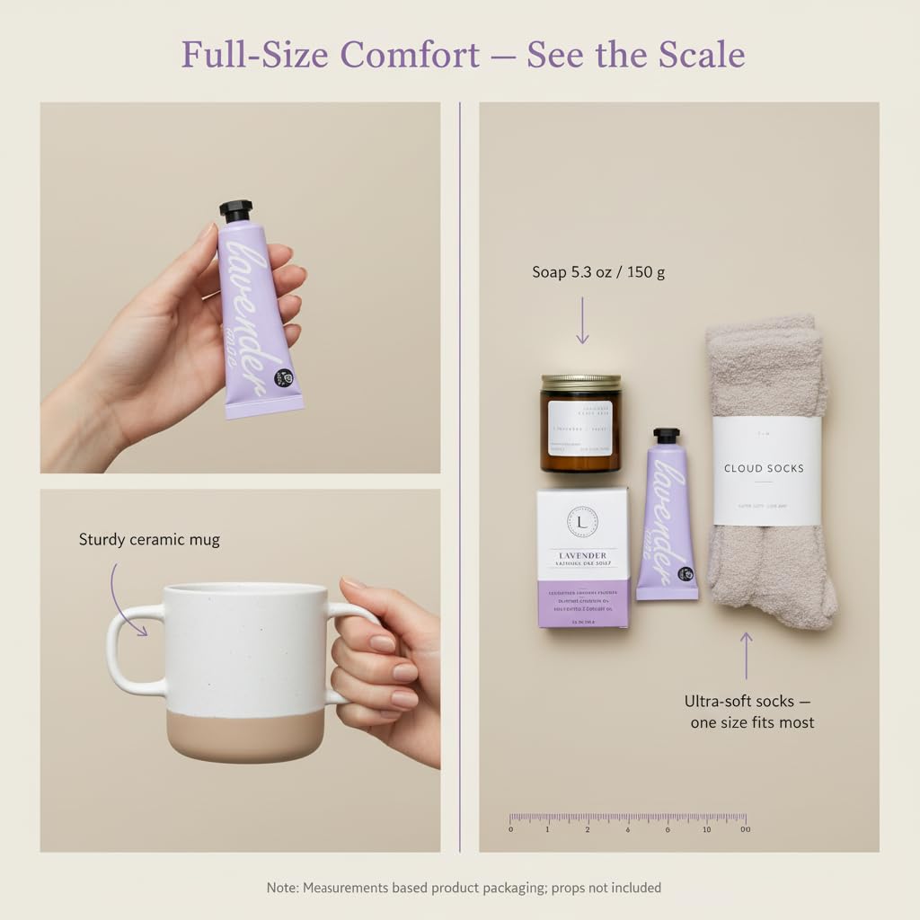 Premium Spa Essentials in One Gift: Includes a lavender soap bar, hydrating lavender‑sage hand cream, soy wax candle, a lavender bath bomb for a soothing soak, fluffy cozy socks, plus lemon balm & mint tea with a speckled ceramic mug and a ‘Sending Hugs’ card—thoughtfully curated for ultimate self‑care.