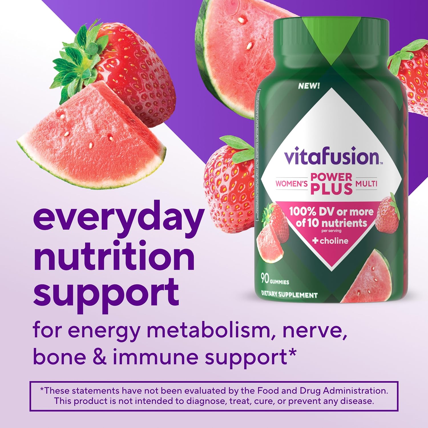Vitafusion Power Plus Women’s Multivitamin Gummies, 100% Daily Value or More of 10 Nutrients, Helps Support Nerve, Energy Metabolism, Bone & Immune Health, Strawberry & Watermelon Flavor, 90 Count