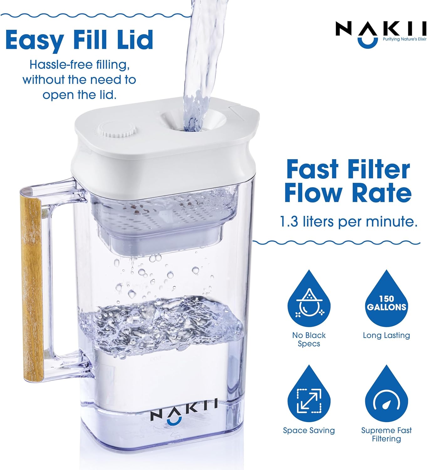TESTED AND CERTIFIED BY THE WQA! The Nakii brand water filter pitchers are manufactured by Water Innovations USA. They are certified by the WQA for NSF/ANSI 42 and NSF/ANSI/CAN 372, for High-Quality Filtration, chlorine taste, odor reduction, and lead-free compliance. The filter has a Life Span of 150 gallons, and a Fast Flow Rate of 1.3 liters per minute. This will give the best and Clearly Filtered Water for you and your family