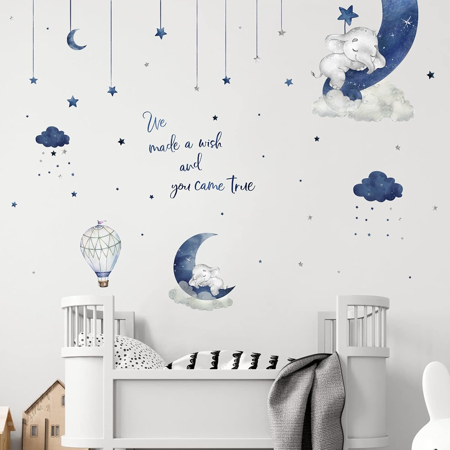 13 reviews for Yovkky Watercolor Blue Grey Sleeping Elephant Wall Decals, We Made a Wish Moon Star Cloud Stickers Hot Air Balloon Nursery Decor, Home Baby Shower Decoration Kids Boy Toddler Bedroom Playroom Art Gift
